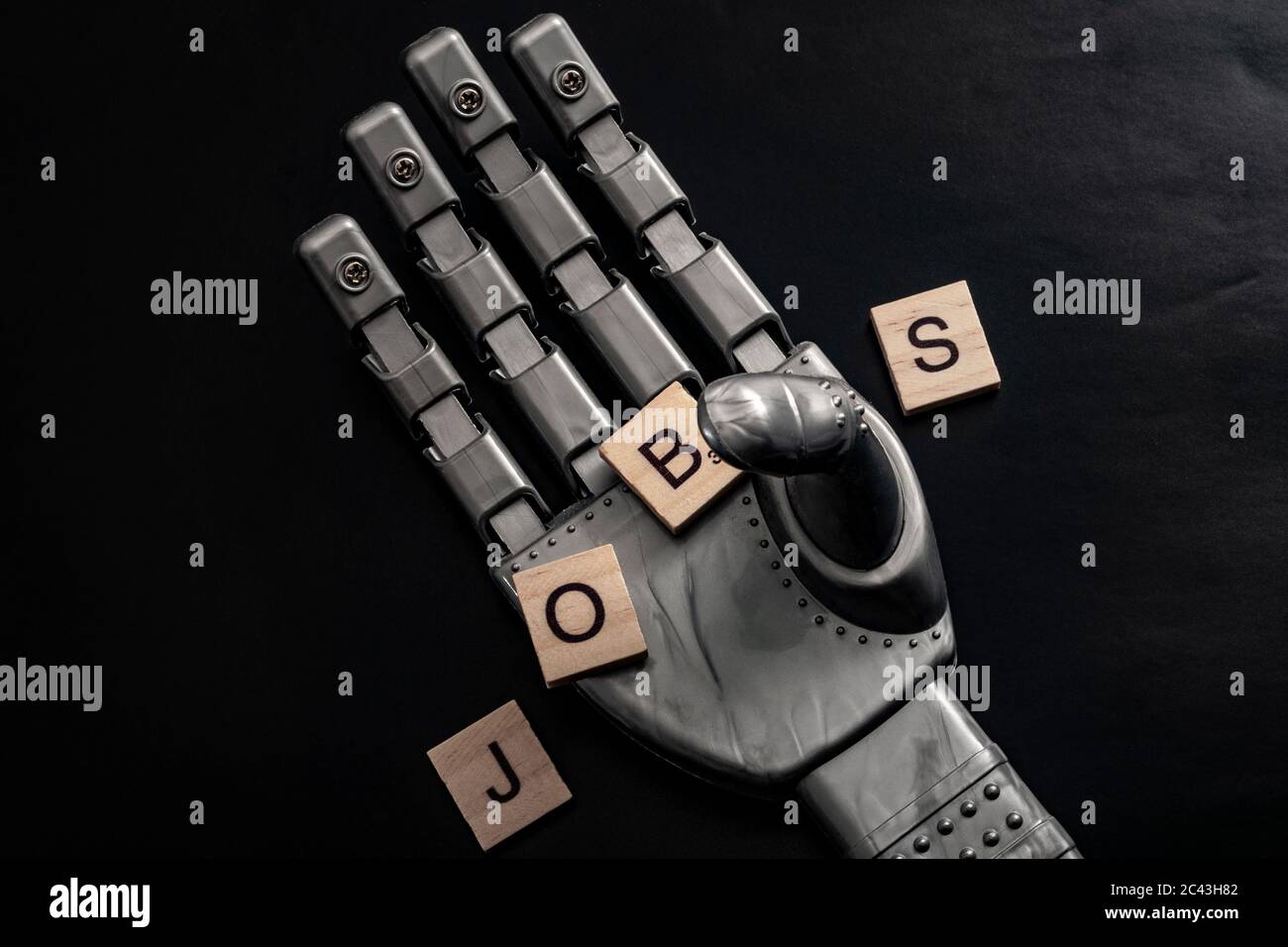 Lose Your Job To Robots Due To Automation And The Rise Of The Machines Concept With A Robot Hand Grabbing Wooden Tiles That Spell Out The Word Jobs On Stock Photo